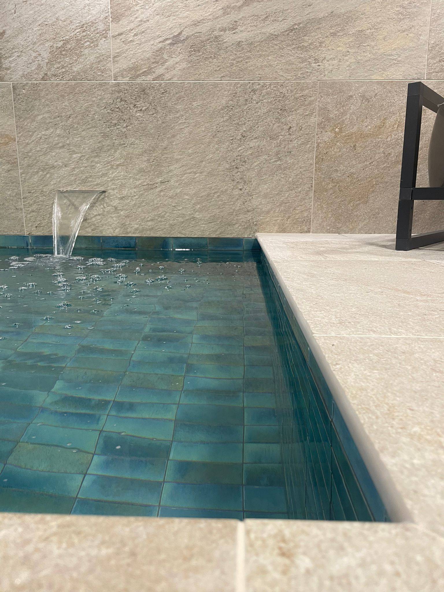 Nos façonneurs ont procédé à la fabrication de margelle travertin sur-mesure en carrelage pour une piscine intérieure d’un showroom revêtement et aménagement sur Fréjus.