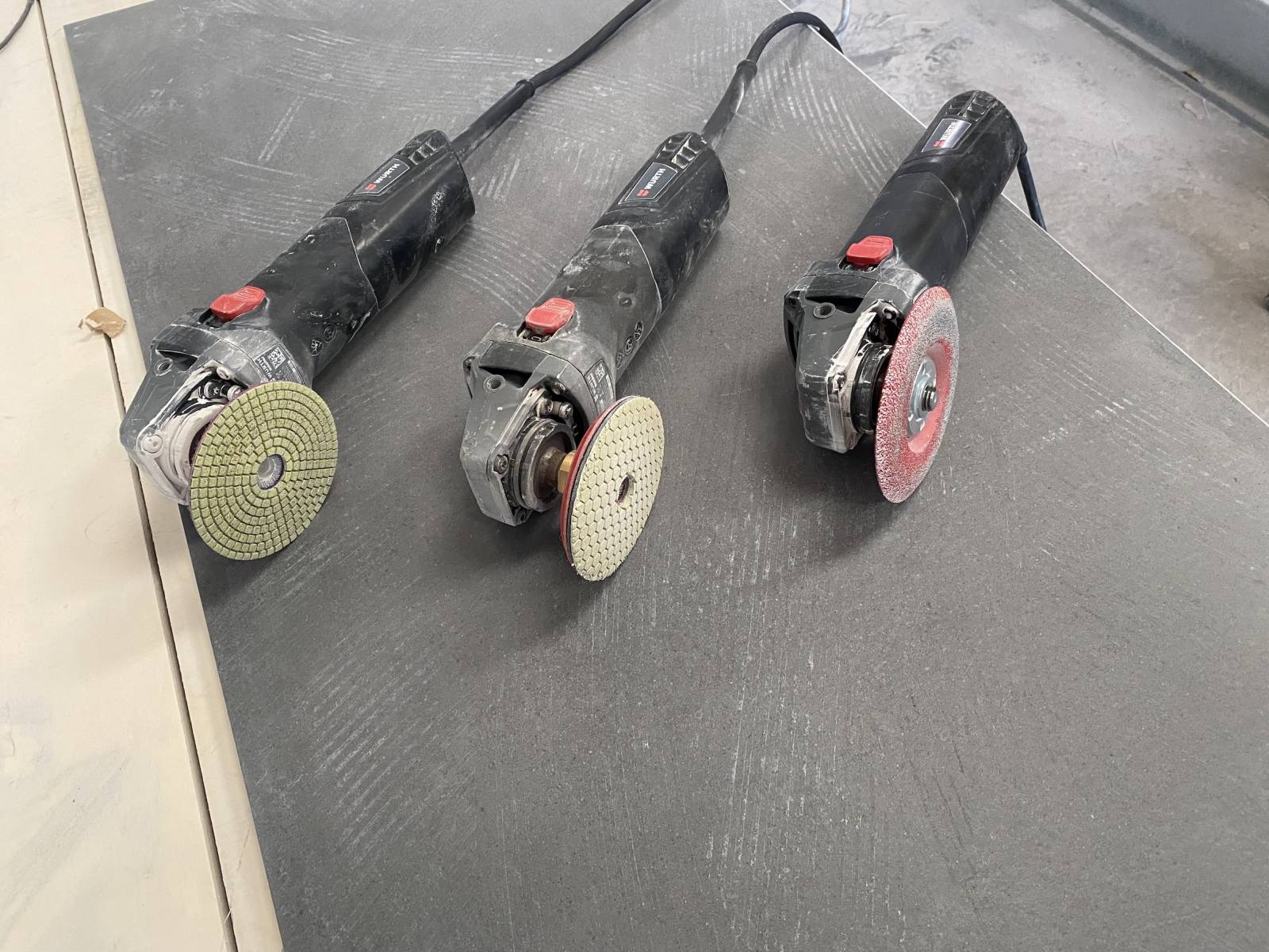 Nous avons transformé un carreau grand format carré de 100x100cm de 10 mm d’épaisseur, pour fabriquer des nez de marche identiques et coordonnés au revêtement de sol de la terrasse.